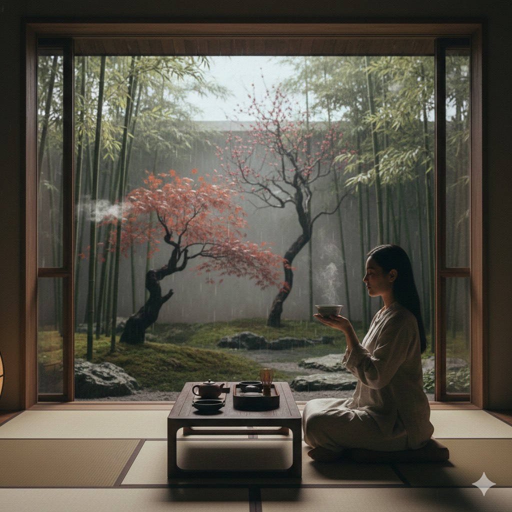 落地窗前有東方韻味的竹、苔、梅、楓,
